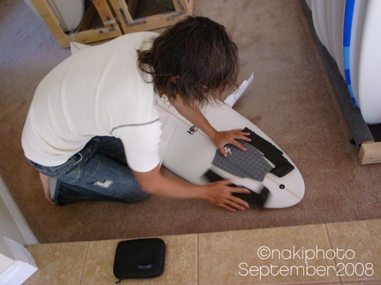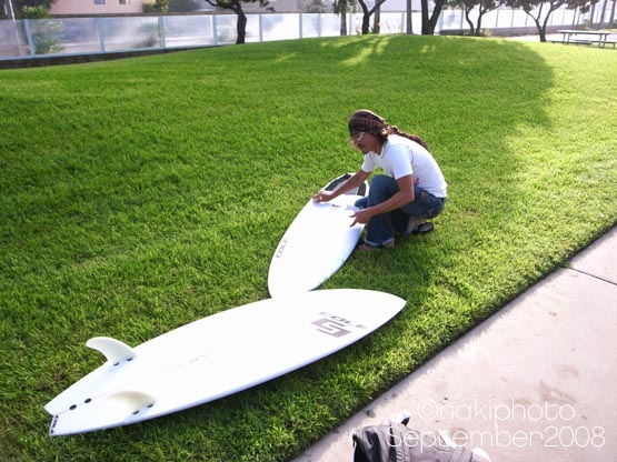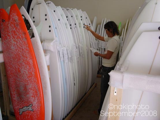 昨日までは柳瀬のMPツインを借りていたのですが、今日は彼も一緒にサーフということで、弊社在庫のストックボードをおろそう、ということになった。