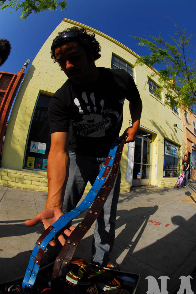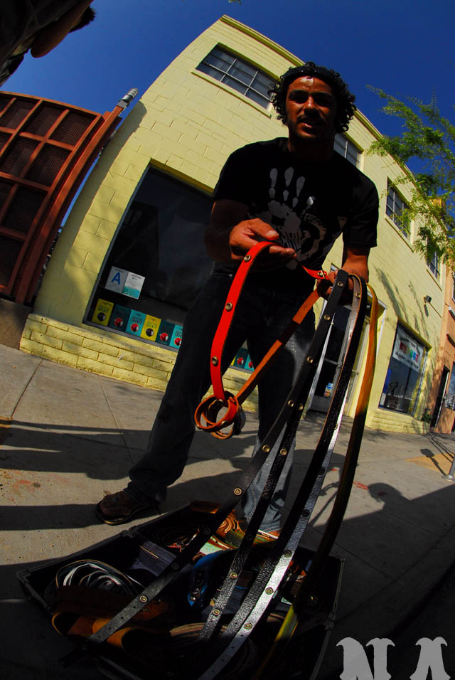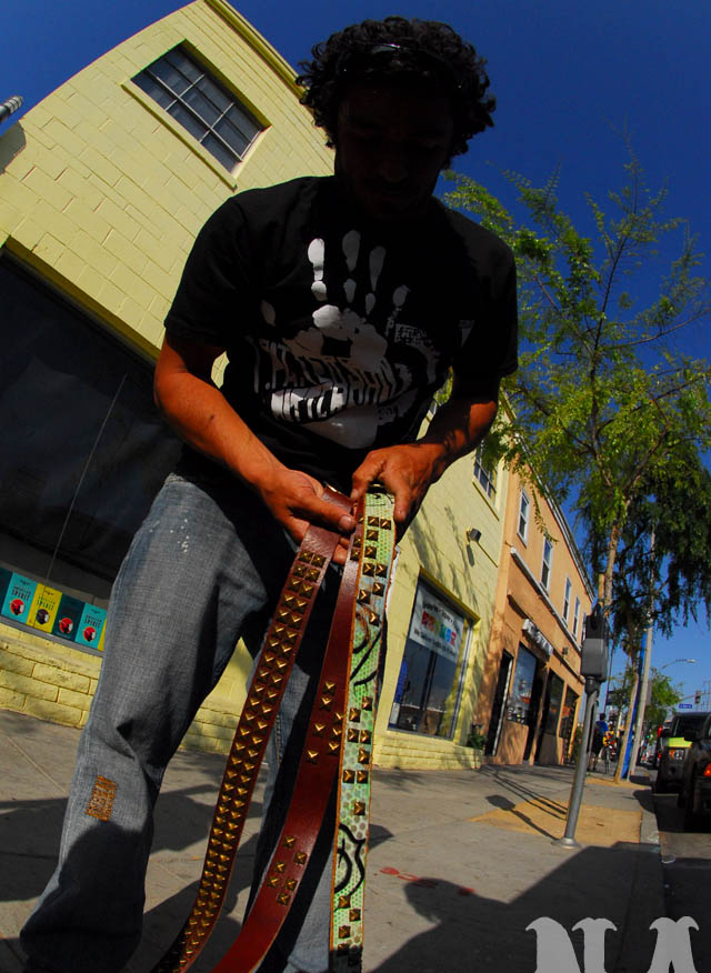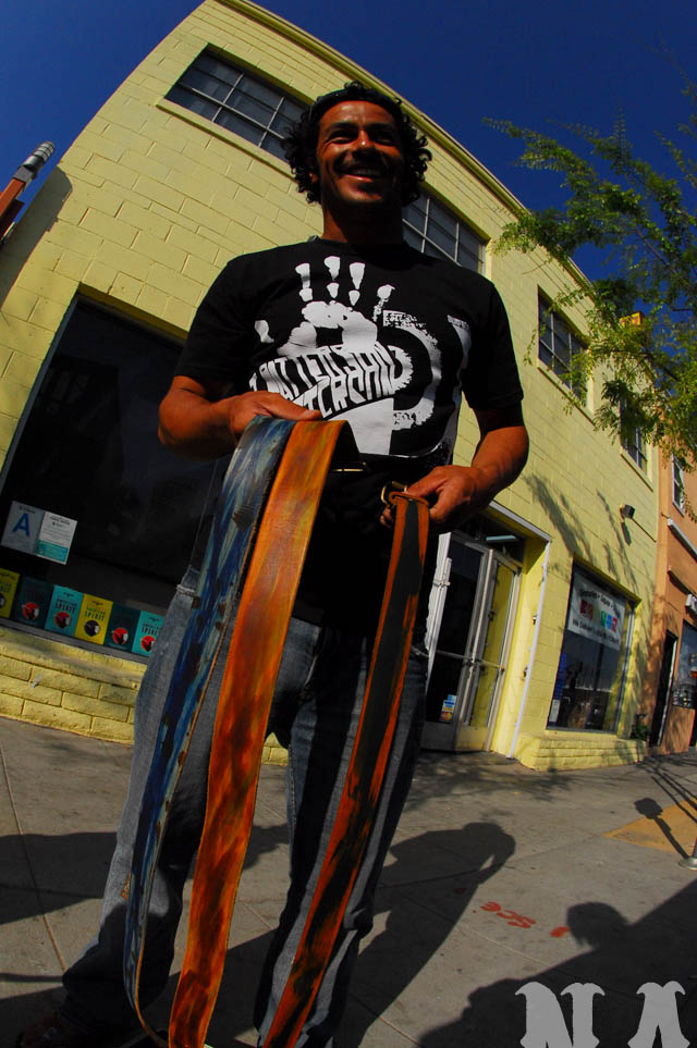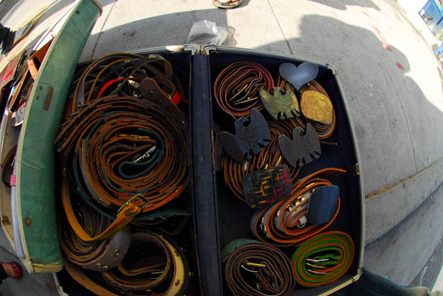 ↓美しいカラーリングのベルトやユニークな加工の革製品は、全て彼の手作りです。