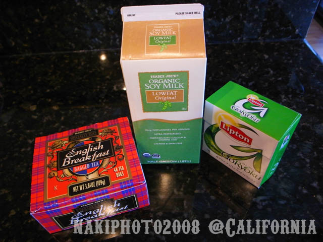 まずお茶を淹れ、その後このトレーダージョーズ豆乳を沸かし、イングリッシュブレックファースト・バッグをマグカップに入れる。