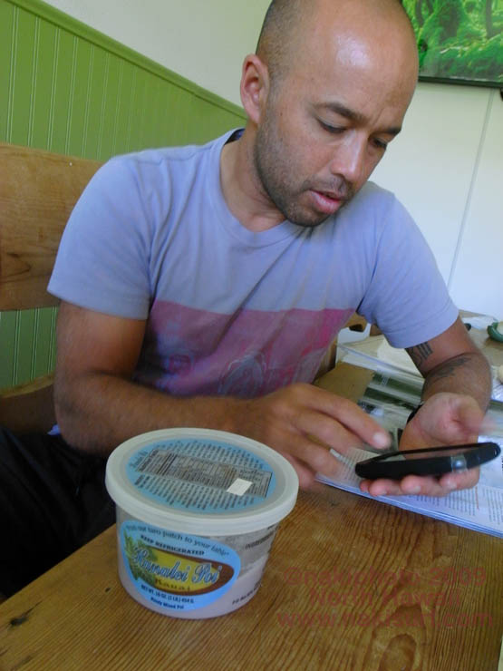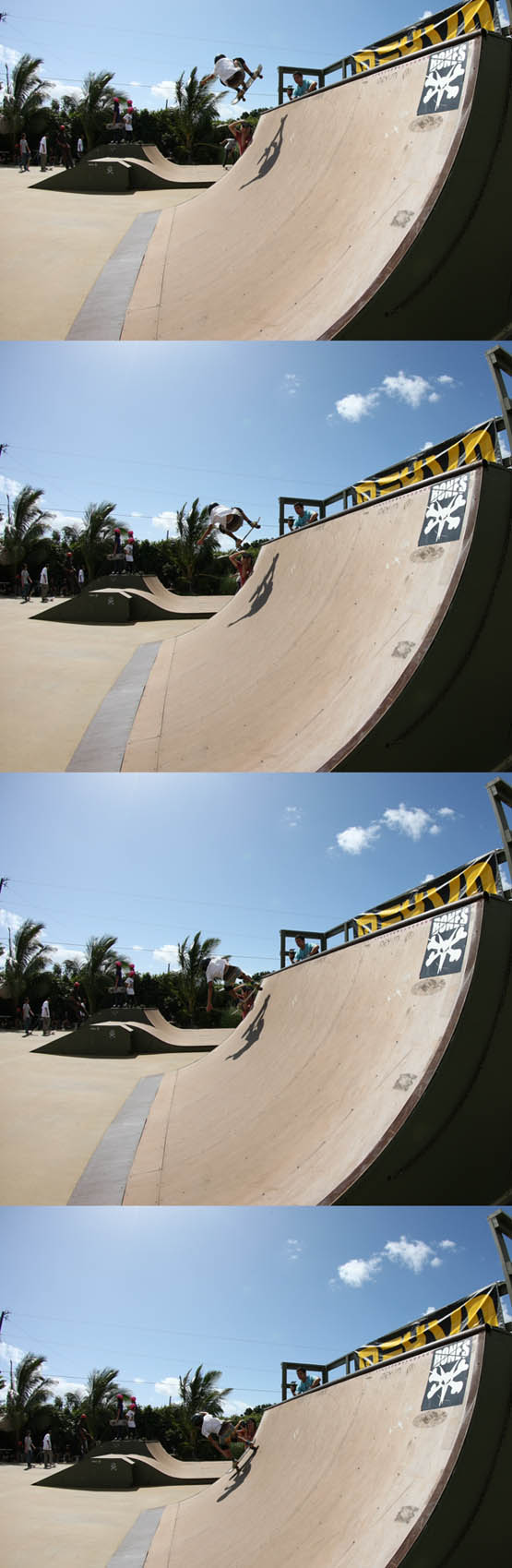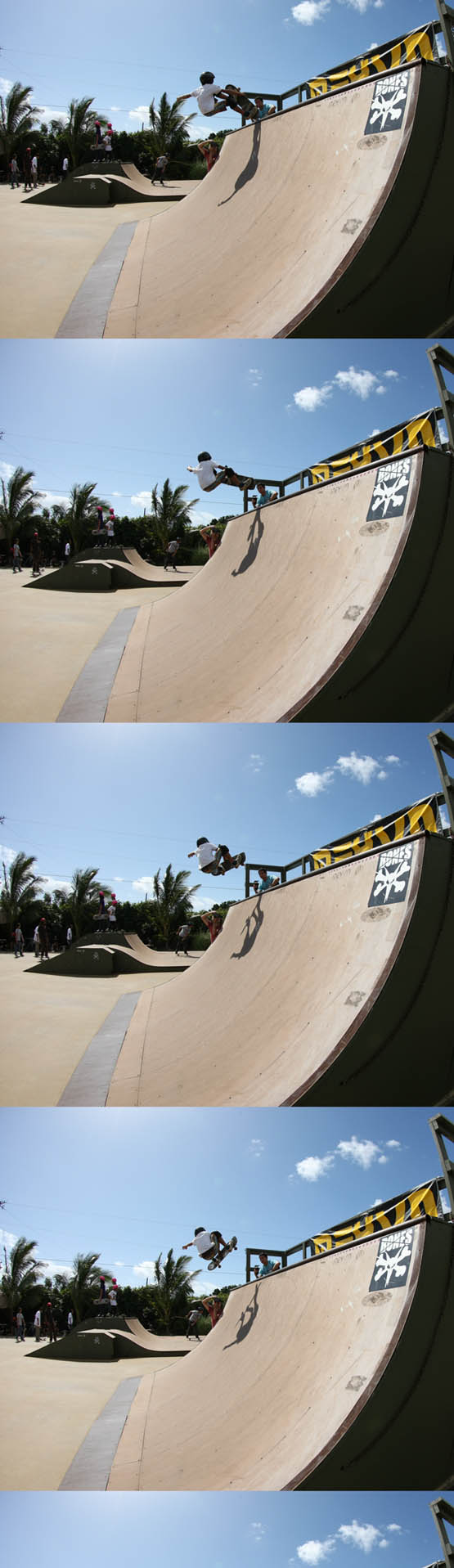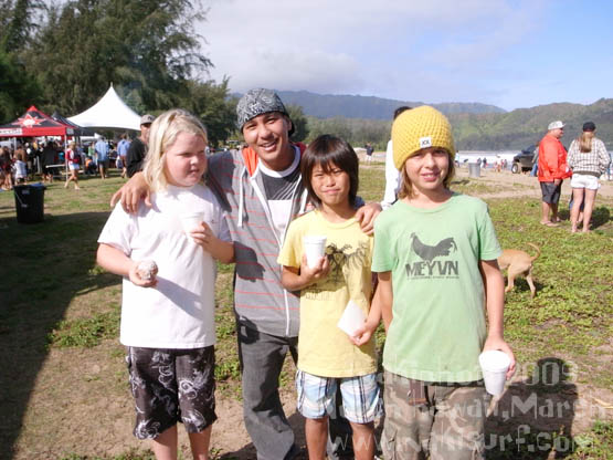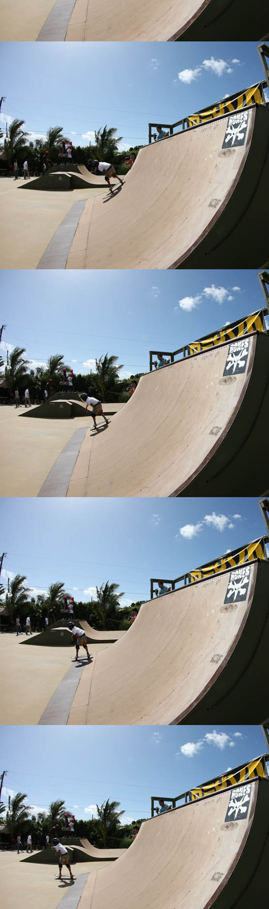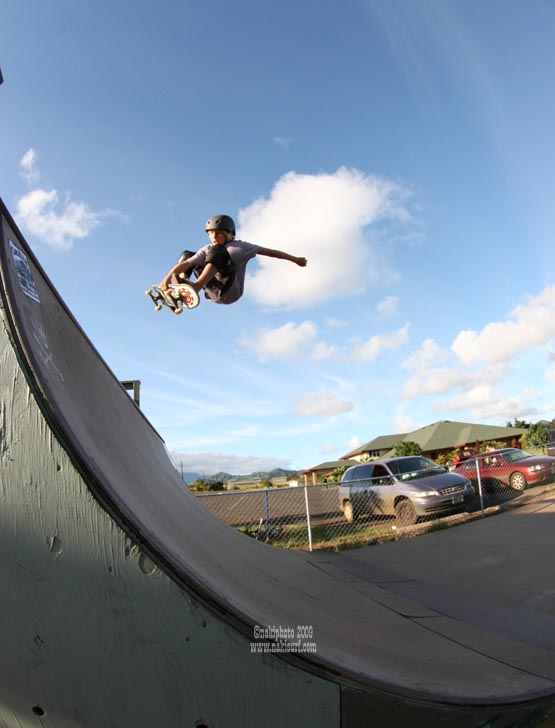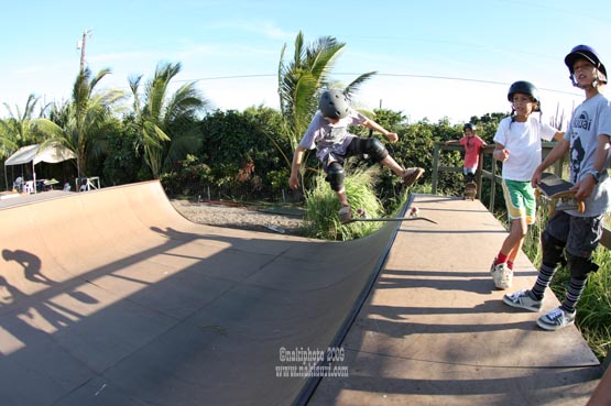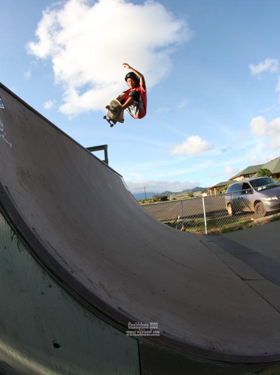 それからスケートボードパークに行き、オアフ島から来ている「サーフ&スケートでもうプロサーファー、怪物11才」のカラニ(・デイビッド)とノアが一緒にスケート。